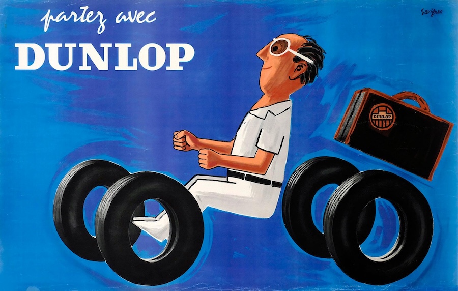 | THE ORIGINAL? Dunlop tires « Partez avec Dunlop » – 1953 Click on the image to enlarge Source : Invaluable Illustration : Raymond Savignac (France) |