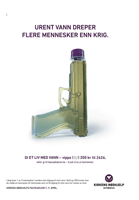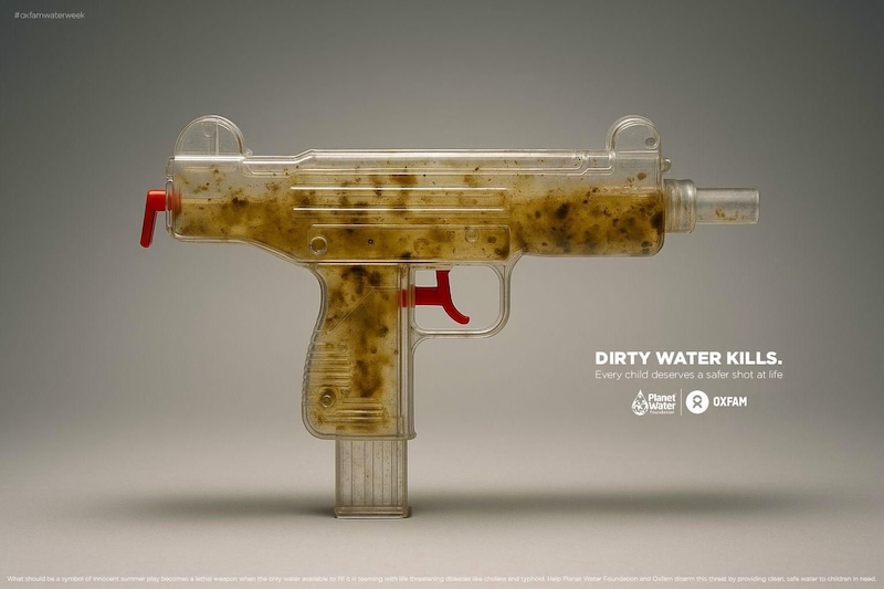 Eng “The creative idea: Unsafe drinking water kills more people than war in some countries. To illustrate this concept, the images show plastic guns filled with stagnant dirty water. Copycat or coincidence? Be the judge!”