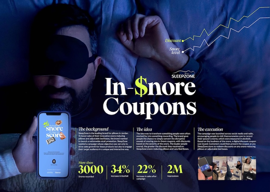 | THE ORIGINAL? Sleepzone « In-snore coupons » – January 2025 « The louder people snore, the greater the discount » Click the image to enlarge Source : Cannes Lions Longlist Agency : Impact BBDO Dubai (UAE) |