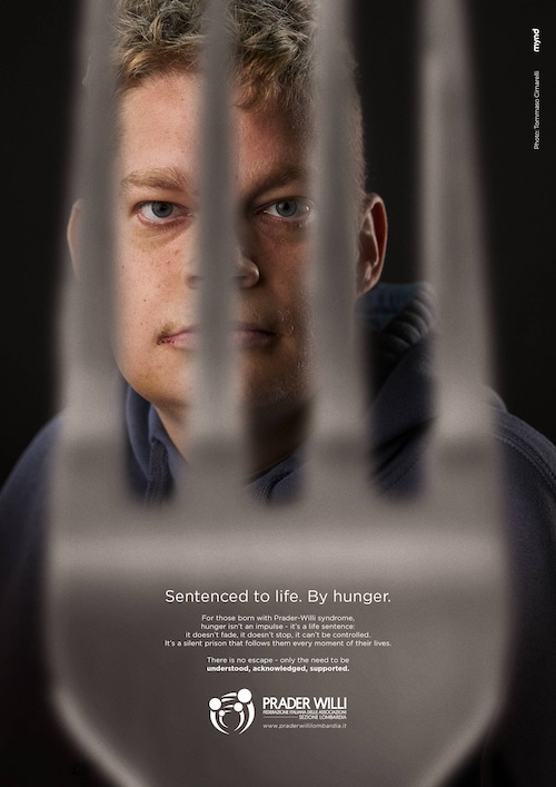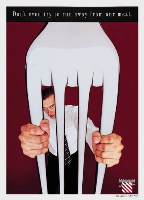 Eng “The creative idea: a fork in the foreground that resembles prison bars, behind which a person is confined. While the subject and message are different, the visual concept is entirely identical. Copycat or coincidence? Be the judge!”