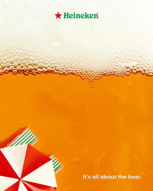 Fr « L'idée créative : Ils ont donné au rivage (vu de dessus) l'apparence d'une pinte de bière. Ce genre de gag visuel assez usé me rappelle entre autres la célèbre campagne Guinness d'il y a quelques années... Si Heineken a essayé de se faire mousser sur les réseaux avec cette annonce, celle de Corona me semble plus réussie. Copie ou coïncidence ? À vous de juger ! »