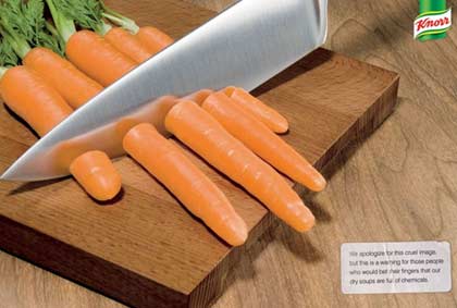 « we apologize for this cruel image, but this is a warning for those people who would bet their fingers that our dry soups are full of chemicals »