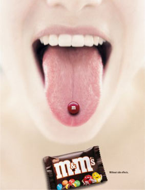 | D’ici un an ou deux on devrait retrouver la même pour skittles ou Smarties… à moins que la mode du piercing soit un peu passée. Ici, le fait que ce soit une pure coïncidence reste assez dur à avaler. |