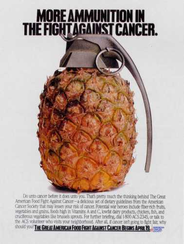 | THE ORIGINAL? Fight Against Cancer – 1990 “More ammunition in the fight against cancer » Source : Luerzer’s Archive Agency : DDB Chicago (USA) |